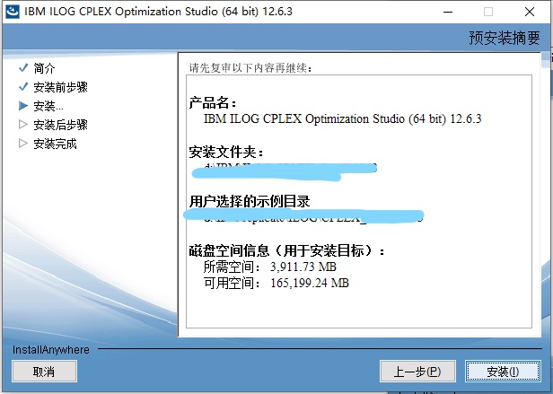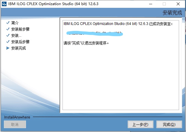 看到上面的界面基本就安装完成了。安装进度条提醒cplex依赖jre,所以需要提前在电脑上安装java环境,如果不会安装java环境请百度。(安装完成后可能会显示让你安装Microsoft Visual C++ Redistributable,不用安装,忽略即可)。