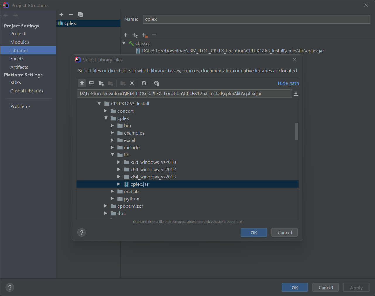 1.将CPLEX安装目录的cplex.jar包添加到项目文件中: