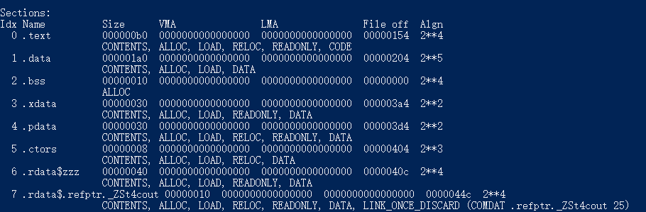 objdump -h .\tmp.o 其中-h表示查看段表