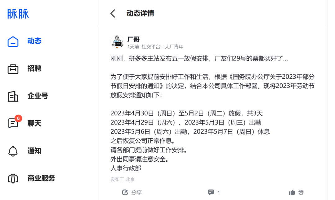 有知情人士在脉脉上爆料,4 月 26 日晚上拼多多内部终于敲定了今年五一的放假时间,然而让员工们感到不尽人意却是——只放三天假,4 月 29 日、5 月 3 日需要正常上班。
