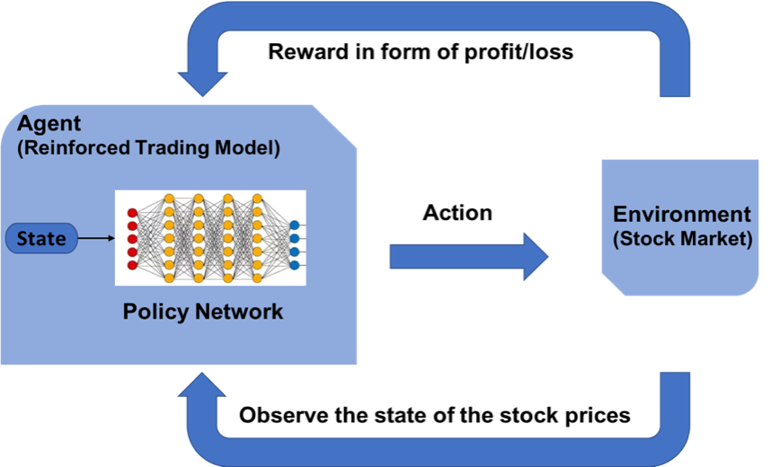 而强化学习是机器学习的另一个分支,在决策的时候采取合适的行动 (Action) 使最后的奖励最大化。与监督学习预测未来的数值不同,强化学习根据输入的状态(如当日开盘价、收盘价等),输出系列动作(例如:买进、持有、卖出),使得最后的收益最大化,实现自动交易。