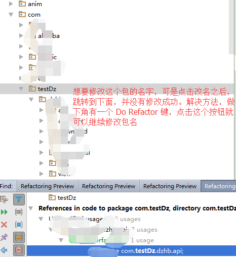 注意:修改成自己想要的包名,有一种情况要说明一下,修改包名不能正常修改而是跳转到 引用该包名的类。解决方法,点击左下角的Do Refactor 继续修改包名