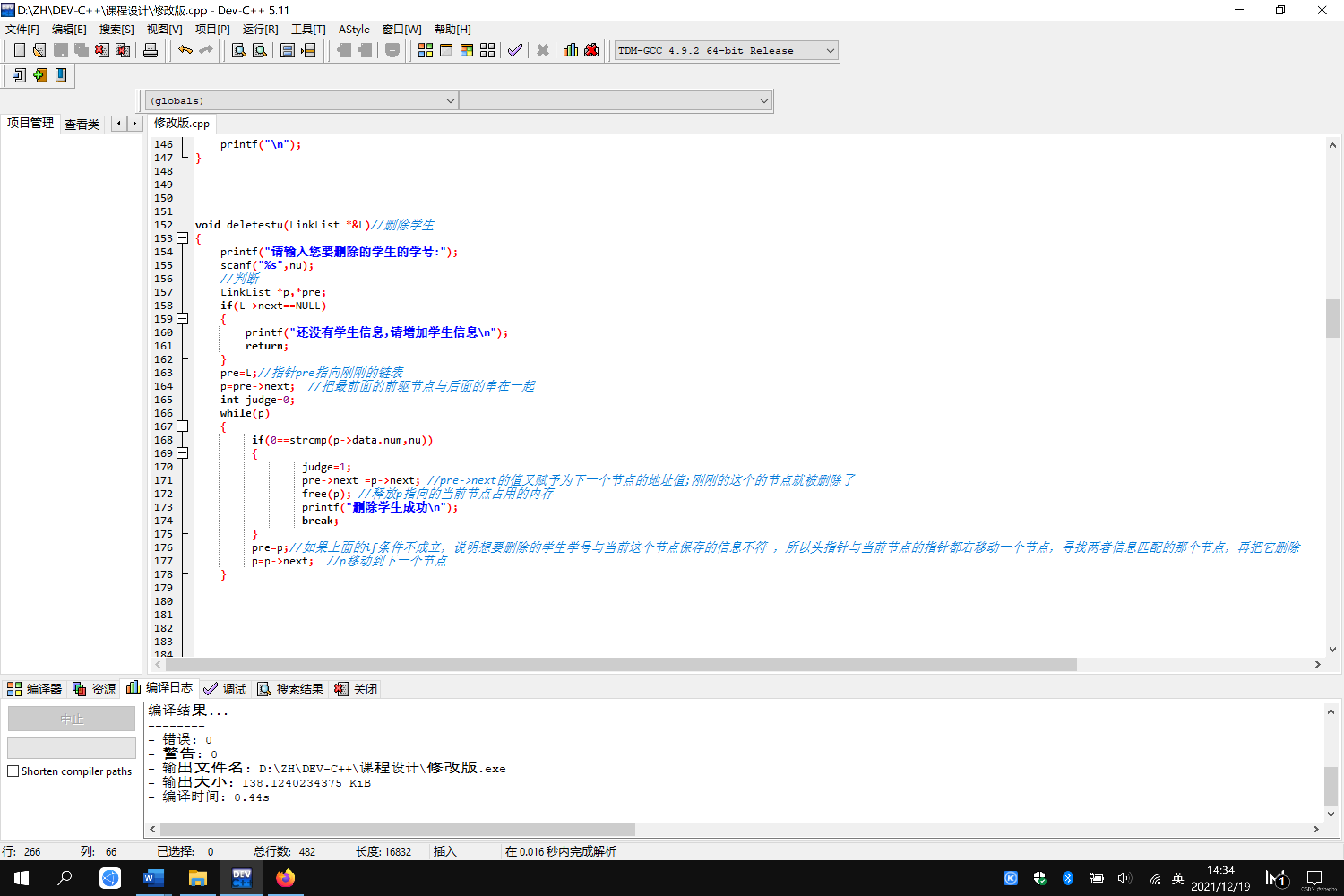 常用的函数如malloc()、calloc()、realloc()、free()、system()、atoi()...用清屏功能以及删除链表释放内存时要用到system("cls");free(p),如图2所示。