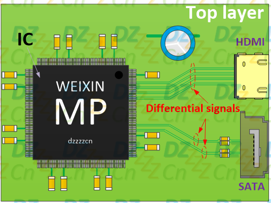 HDMI(High Definition Multimedia Interface, 高清晰度多媒体接口)是一种数字化音视频接口技术,适合影像传输的专用型数字化接口,它由4对差分线组成。我们使用的SATA(Serial Advanced Technology Attachment,串行ATA接口规范)硬盘也包含接收与发送两对差分信号线,如下图所示: