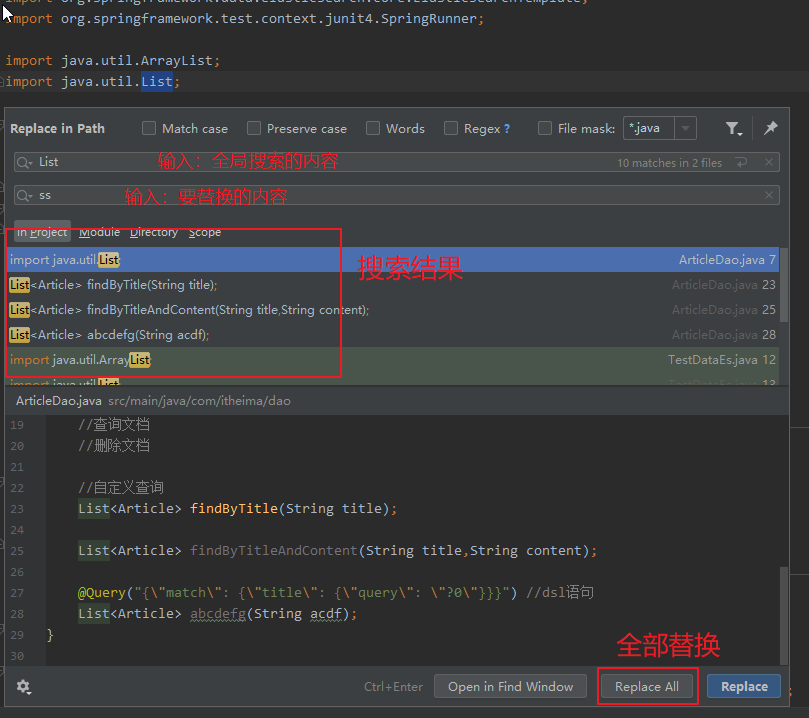 全局:ctrl + shift + r: 在路径中替换,指的是在选定的目录下或者类包下,查找要被替换的字符。