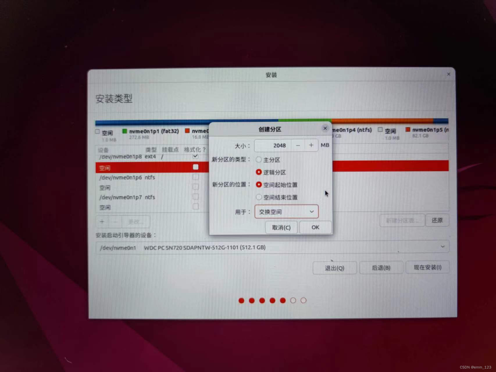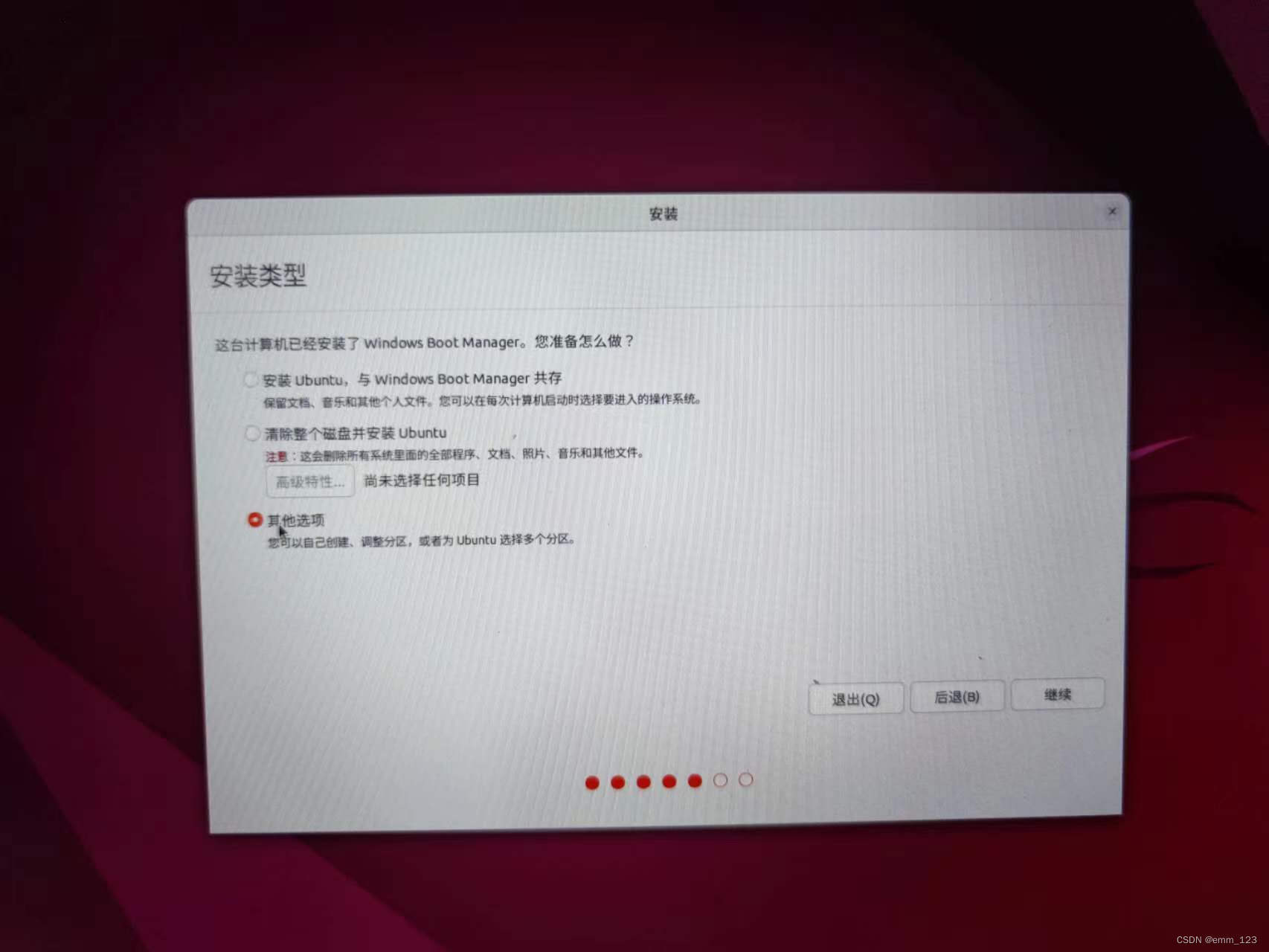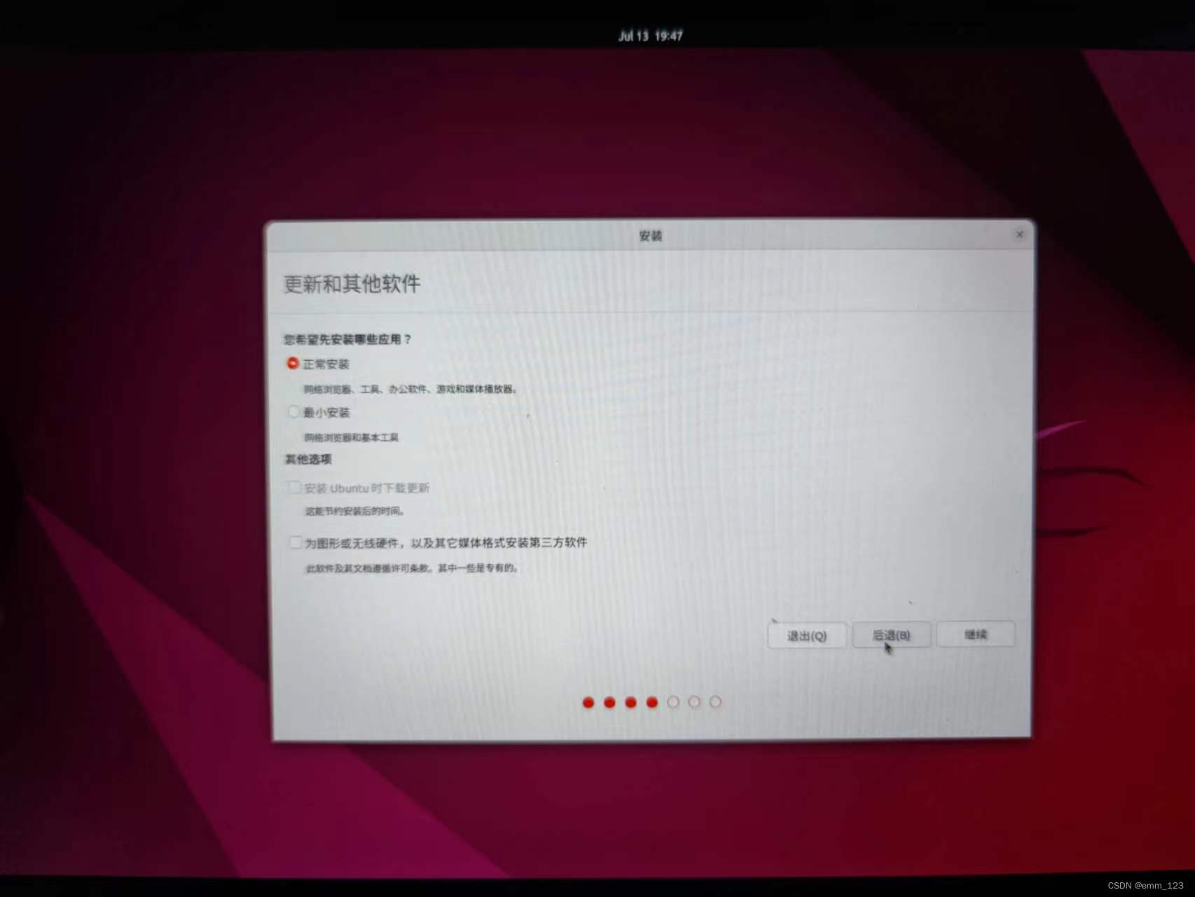 7.选Try or install Ubuntu(好像是第一个选项),进入图形化界面安装,前几项都按照需求选,一个需要注意的小点是先不要联网。
