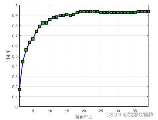 endfigure, plot(result(:, 2),'-bs',...'LineWidth',2,...'MarkerSize',8,...'MarkerEdgeColor','k',...'MarkerFaceColor',[0.0,0.9,0.0]);xlabel('特征维度')