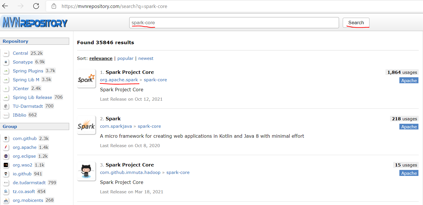 2.在搜索框输入:spark-core,点击搜索,选择Apache版本的