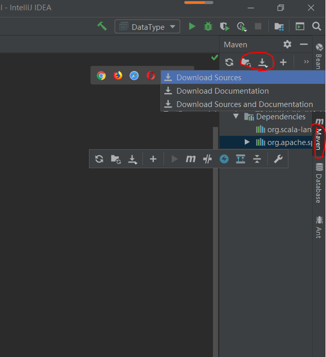 之前如果没有添加过依赖包,字段“org.apache.spark”、“spark-core_2.12”和“3.1.1”是红色的,说明IDEA里面没有该源码包,此时需要下载源码,点开IDEA右侧maven视图,找到下面带有红色波浪线的地方(下图没有是因为我下载过了),然后点击下载符号,选择“Download Sources”下载即可。(Download Sources是下载源码,Download Documentation是下载文档,一般选择下载源码)