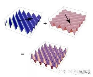 对于三角平面波,可以这样理解,在一个方向上存在一个三角函数,在法线方向上将其拉伸。前面说过三个参数可以确定一个一维的三角波。哪几个参数可以确定一个二维的三角平面波呢?答案是四个,其中三个和一维的情况一样(频率 ,幅度 A ,相位 ),但是具有相同这些参数的平面波却可以有不同的方向。如下图所示: