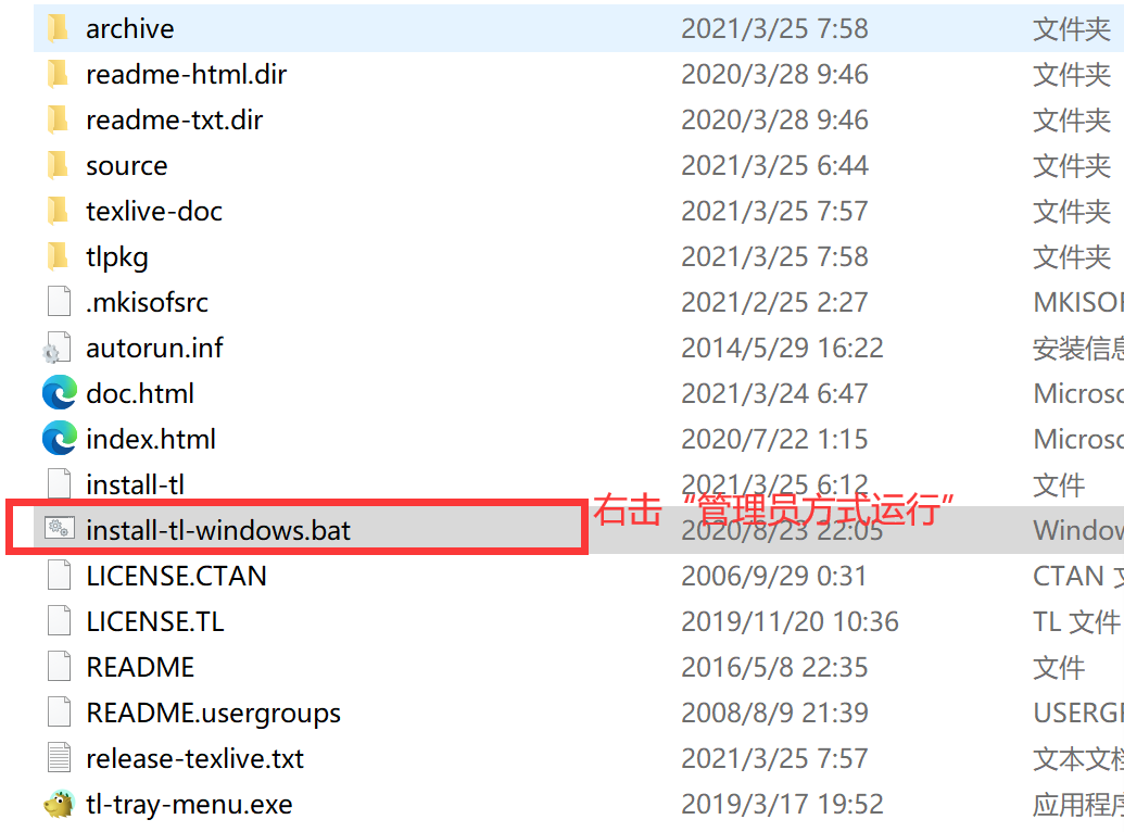 - 将 texlive2021.iso 文件进行解压,然后双击打开其中的 install-tl-windows.bat 文件。