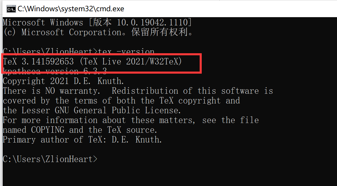 - 检查:WIN+R 调出搜索框,搜索 cmd,输入 tex -version,如果出现版本号,即安装成功。
