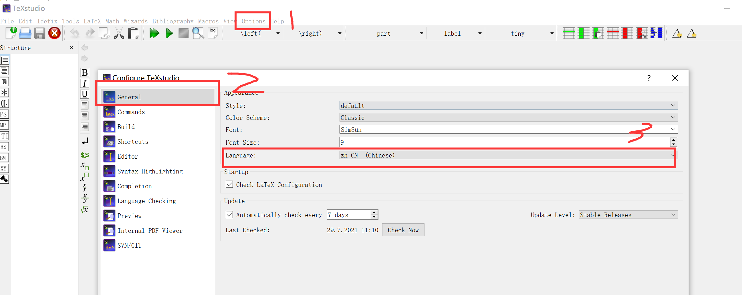 - 中文配置:打开texstudio,选择options——configure texstudio-General-Language