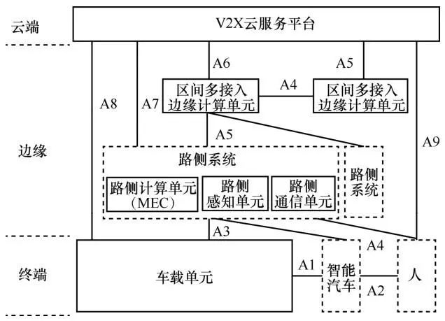 ·边缘,主要包括路侧系统(road side system, RSS)和区间多接入边缘计算(multi-access edge computing,MEC)单元。其中,路侧系统从逻辑上包括路侧通信单元 RSU (road side unit)、路侧感知单元(雷达、摄像头、交通信号灯与指示牌、气象环境感知单元等)和路侧计算单元(MEC);区间MEC 综合处理来自 V2X 云服务平台和多个路侧系统的信息,并与V2X云服务平台、RSS实现交互。