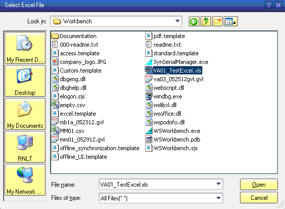 - 选择适当的电子表格。在我们的示例中,我们将选择名为"VA01_TestExcel.xls"的电子表格,如上所示。单击"打开"。