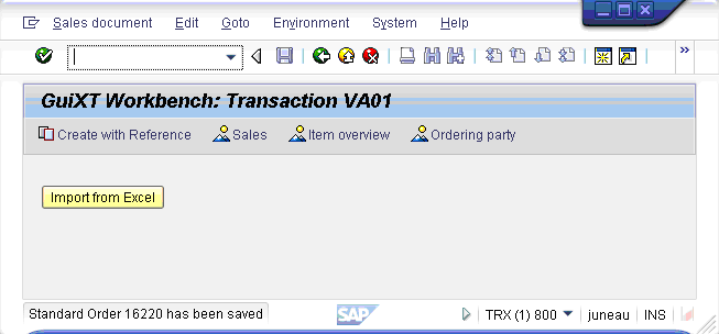 - 重新启动 SAP 并导航到 VA01 屏幕。它现在应显示如下例所示。您现在可以根据需要输入数据。