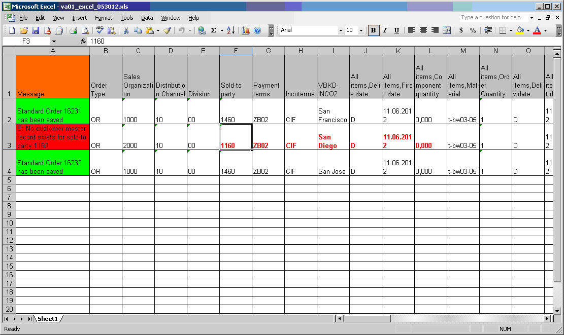 - 如果发生任何错误,您可以手动编辑 Excel 工作表以更正错误。进行更改后,关闭 Excel 电子表格,然后单击 SAP 中的"导入"按钮。
