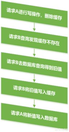 请求A进行写操作,删除缓存 -> 请求B查询发现缓存不存在 -> 请求B去数据库查询得到旧值 -> 请求B将旧值写入缓存 -> 请求A将新值写入数据库