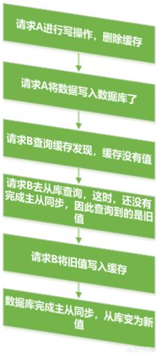 请求A进行写操作,删除缓存 -> 请求A将数据写入数据库了 -> 请求B查询缓存发现,缓存没有值 -> 请求B去从库查询,这时,还没有完成主从同步,因此查询到的是旧值 -> 请求B将旧值写入缓存 -> 数据库完成主从同步,从库变为新值。