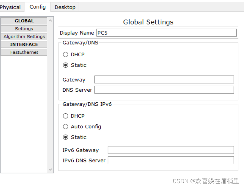 pc5的配置也是如同pc1一样,网关和子网掩码一样(因为是同一网段的)。