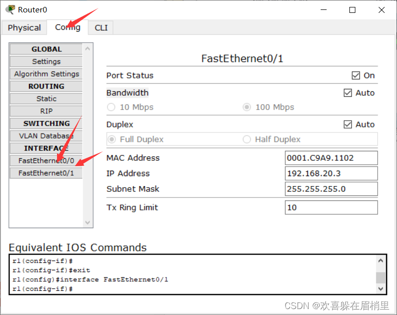 然后给router 0的Fa0/0口配置ip地址为:192.168.30.1,Fa0/1口为:192.168.20.3