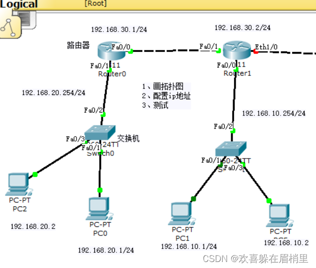 然后可以从拓扑图中看出,我们的router 0直连路由的是20网段和30网段的,而router 1直连路由的是30网段和10网段的。