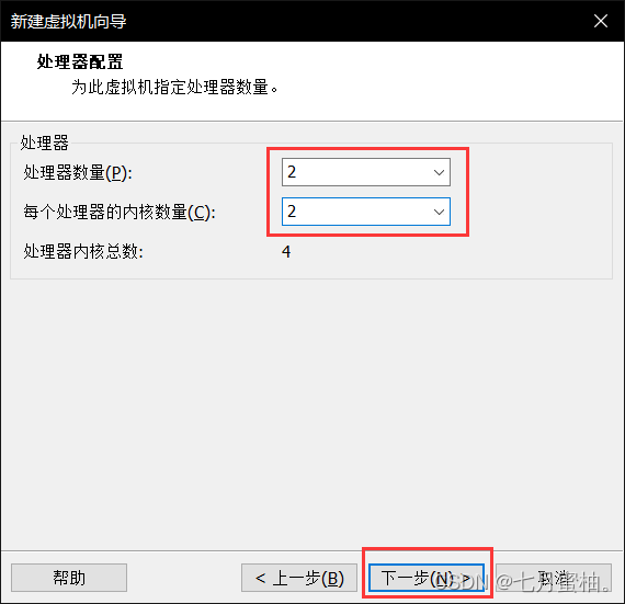 7.处理器数量与每个处理器的内核数量选择2*2>点击下一步