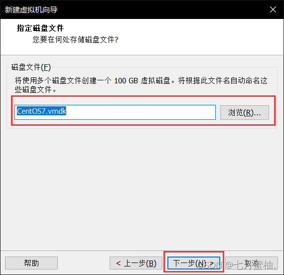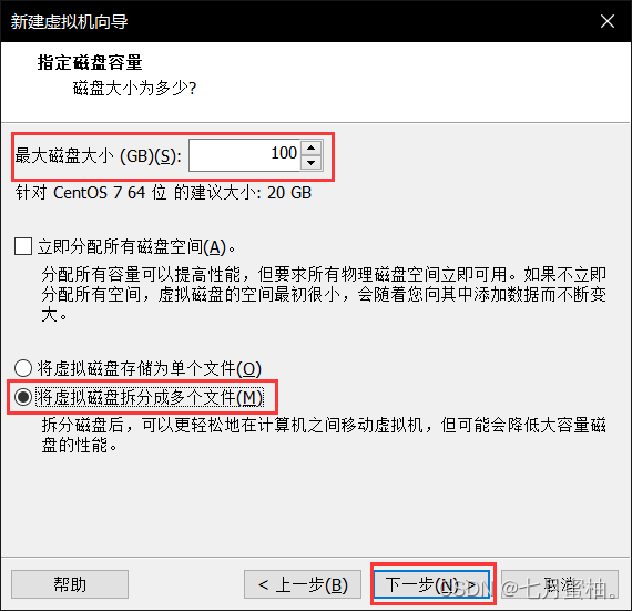 13.最大磁盘大小设置为100G>点击将虚拟磁盘拆分成多个文件>点击下一步