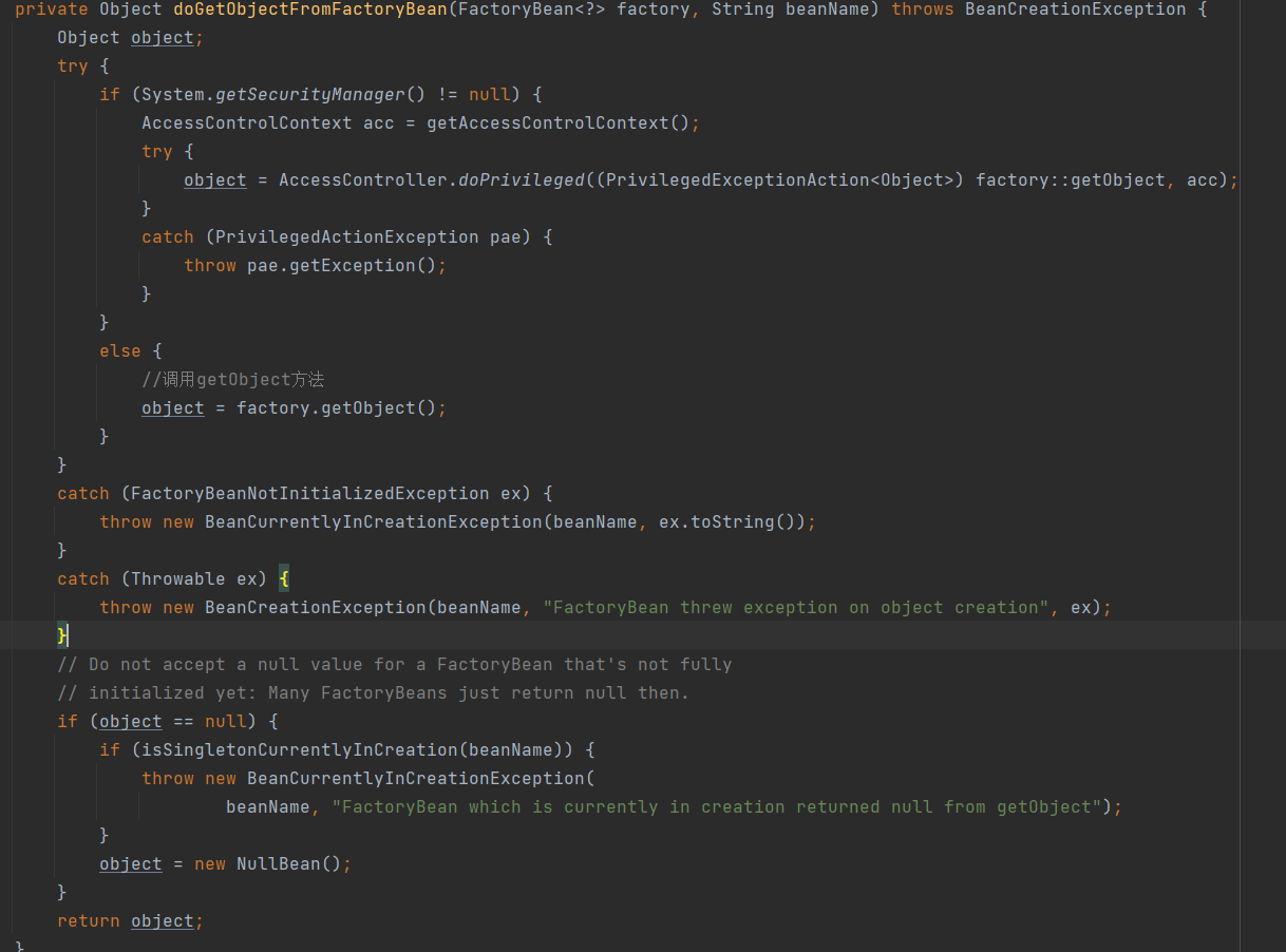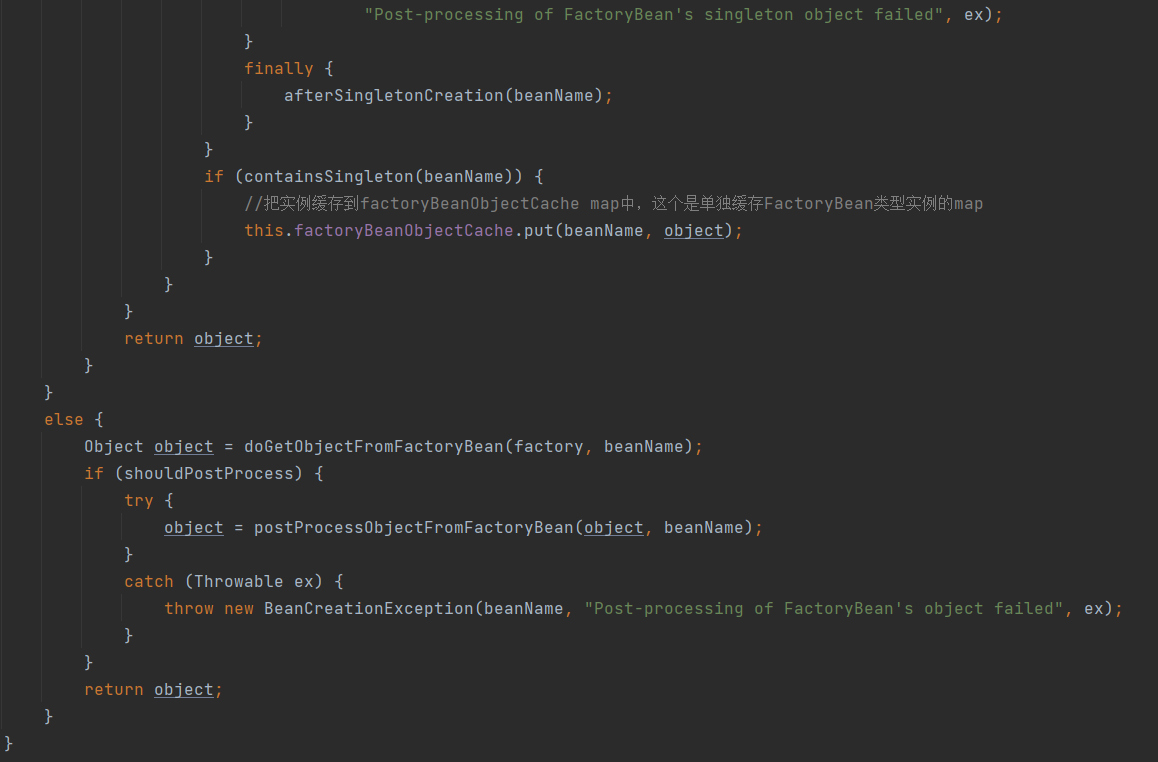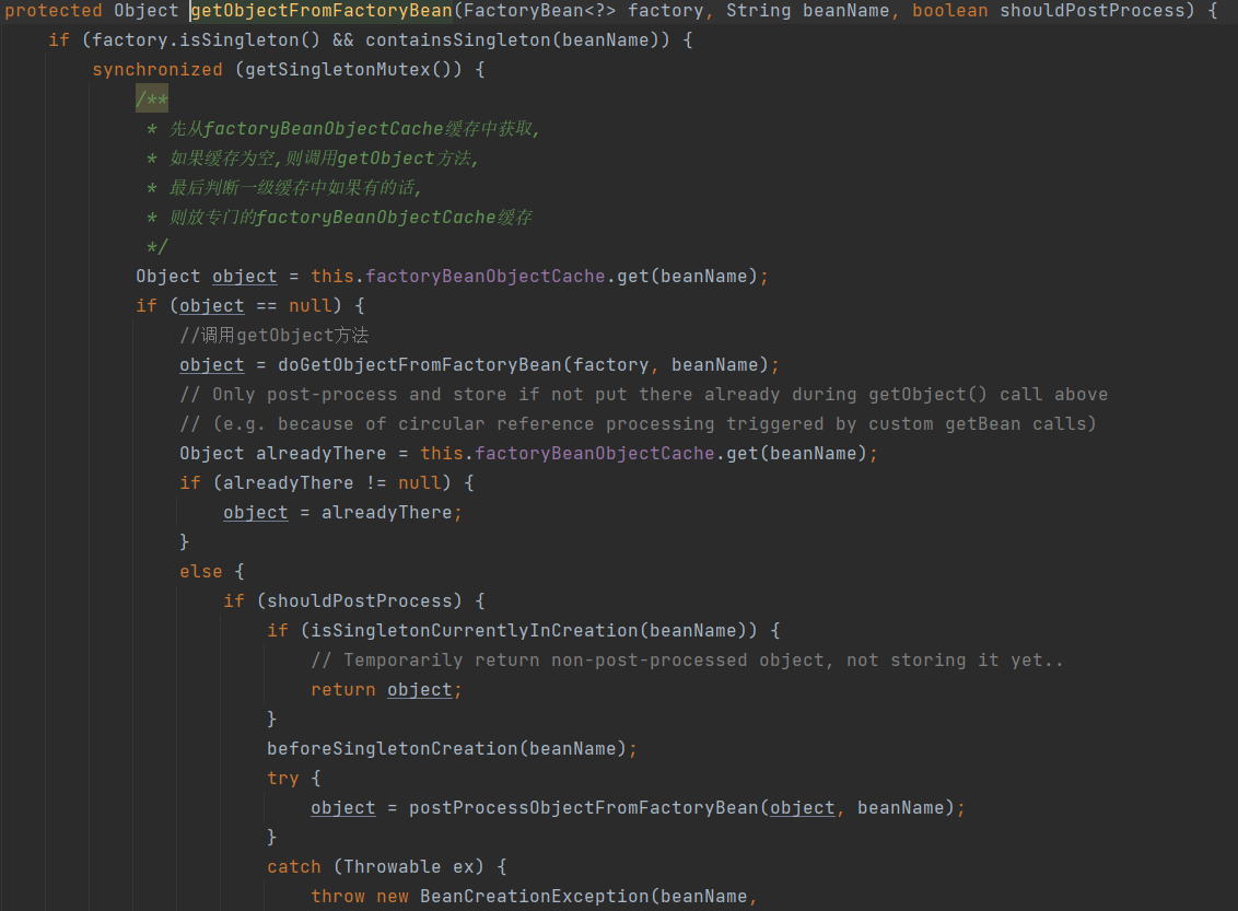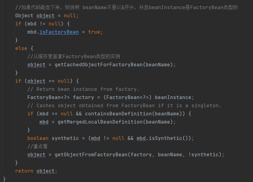 前边是校验 (如果name以“&”为前缀,但是beanInstance不是FactoryBean,则抛异常) 通过之后是从缓存中获取到factroyBean的实例