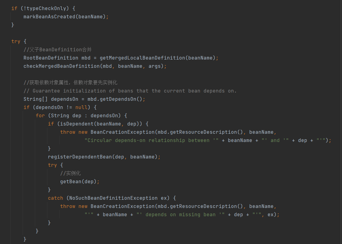 3.拿到当前bean所依赖的beanName集合,实例化自己之前先要实例化自己依赖的bean