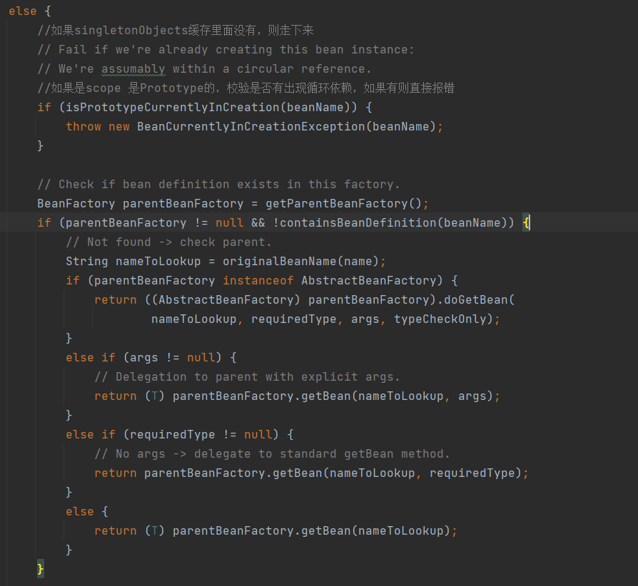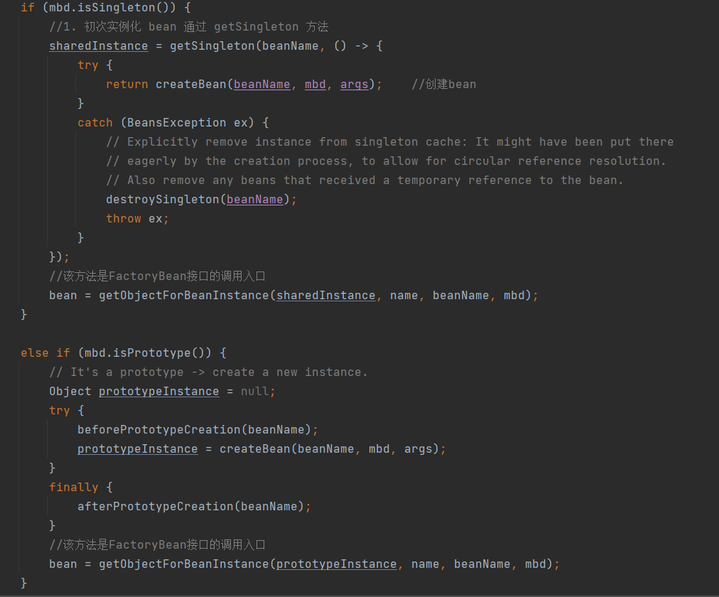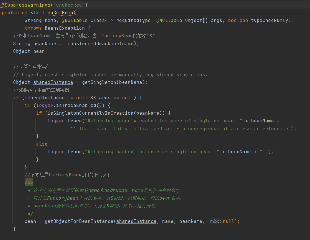 一种是在缓存实例中能拿到bean, (主要是factroyBean的处理, 执行所有已注册的 BeanPostProcessor 的 postProcessAfterInitialization 方法)