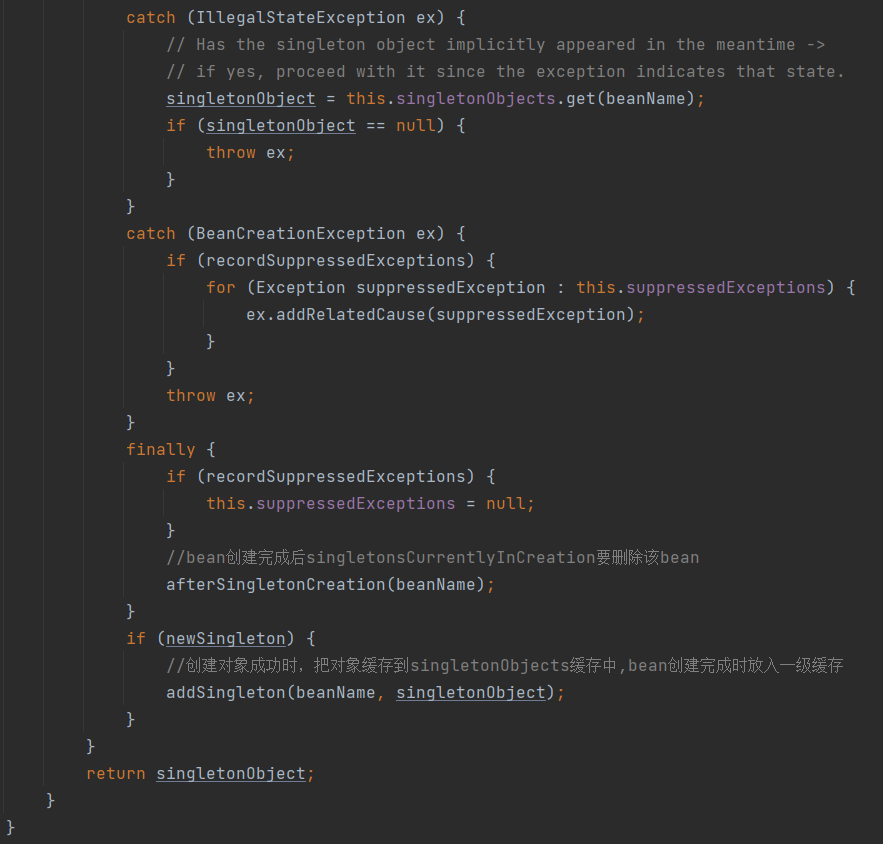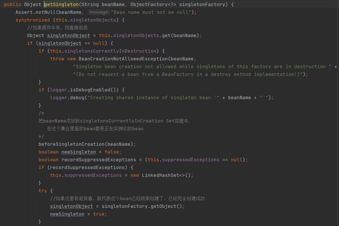 beforeSingletonCreation 吧正在实例化的bean添加到容器中 创建完成后这个方法afterSingletonCreation 吧从正在创建实例化容器中将beanName移除