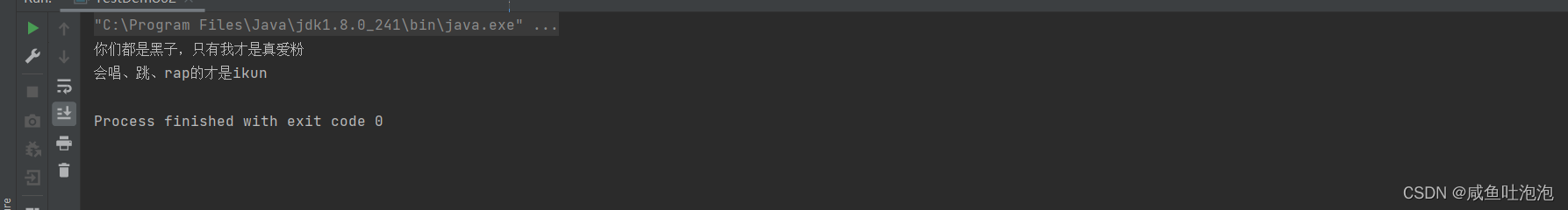 public class TestDemo02 {public static void main(String[] args) {Ikun ikun = new Ikun();ikun.show(new Peopel() {@Overridepublic void dance() {System.out.println("你们都是黑子,只有我才是真爱粉");}});ikun.show(new Peopel() {@Overridepublic void dance() {System.out.println("会唱、跳、rap的才是ikun");}});}
