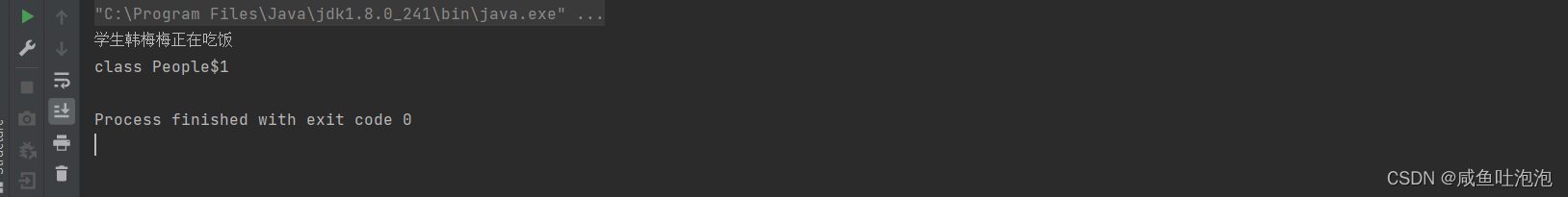 class People{private String name;public void method(){Behavior student = new Behavior() {@Overridepublic void eat() {System.out.println("学生韩梅梅正在吃饭");}};student.eat();System.out.println(student.getClass());//获取全路径类名}