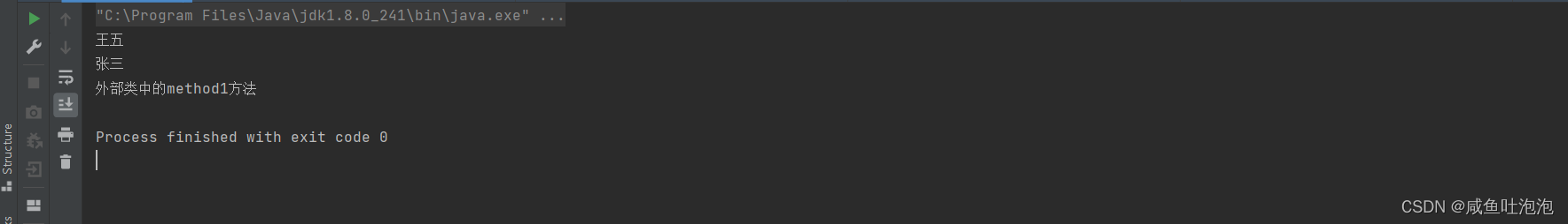 class Person{//外部类private String name = "张三";private int age = 20;private void method1(){System.out.println("外部类中的method1方法");}public void method2(){final class Student{//局部内部类可以加fianl关键字private String name = "王五";public void method3(){System.out.println(name);//遵循就近原则System.out.println(Person.this.name);//同名时访问外部成员method1();//可以访问外部类中的成员}}/*** 外部类访问局部内部类的方式:创建对象再访问*/Student student = new Student();student.method3();}
