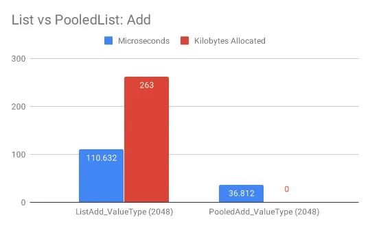 需要110us(根据实际跑分结果,图中的毫秒应该是笔误)和263KB内存,而PooledList<T>