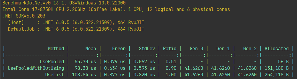 { using var list = new PooledList<string>(1024); for (var index = 0; index < List.Length; index++) { var item = List[index]; list.Add(item); } return list.Count;