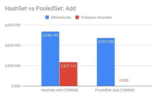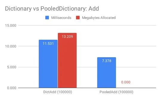需要11ms和13MB内存,而PooledDictionary<TKey, TValue>