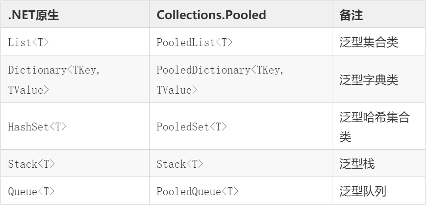 类库中,它针对我们常使用的集合类型都实现了池化的版本,和.NET原生类型的对比如下所示。