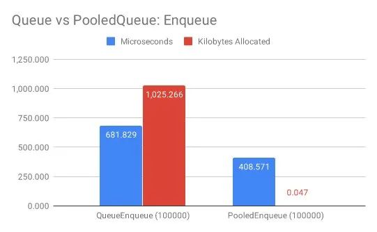 在Benchmark中循环向队列添加10_0000个元素,.NET原生的PooledQueue<T>