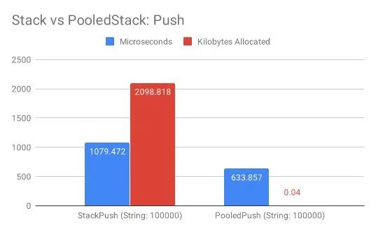 在Benchmark中循环向栈添加10_0000个元素,.NET原生的PooledStack<T>