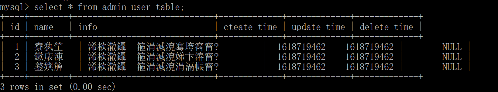 CREATE TABLE `admin_user_table` (`id` INT ( 11 ) UNSIGNED NOT NULL AUTO_INCREMENT COMMENT '主键',`name` VARCHAR ( 40 ) CHARACTER SET utf8 NOT NULL DEFAULT '' COMMENT '姓名',`info` VARCHAR ( 100 ) CHARACTER SET utf8 NOT NULL DEFAULT '' COMMENT '个人信息',`cteate_time` INT ( 11 ) DEFAULT NULL COMMENT '创建时间',`update_time` INT ( 11 ) DEFAULT NULL COMMENT '更新时间',`delete_time` INT ( 11 ) DEFAULT NULL COMMENT '删除时间',