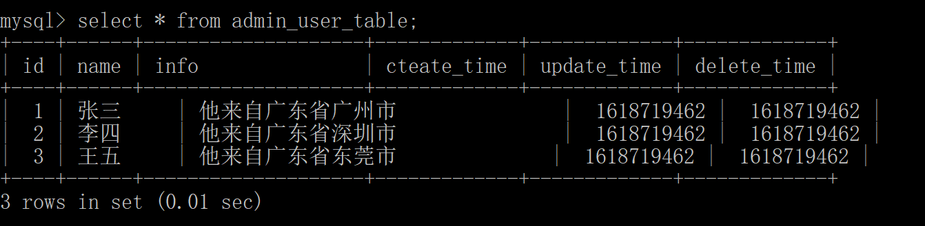 VALUES( 3, '王五', '他来自广东省东莞市', 1618719462, 1618719462, NULL );