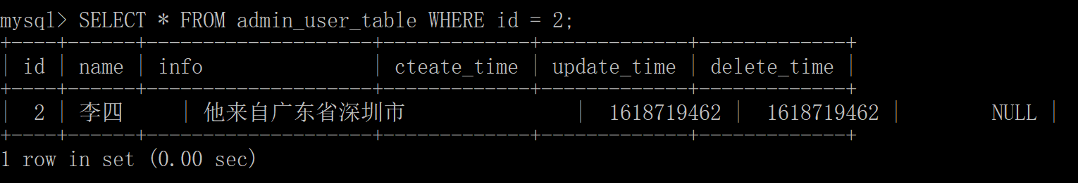 VALUES( 2, '李四', '他来自广东省深圳市', 1618719462, 1618719462, NULL );