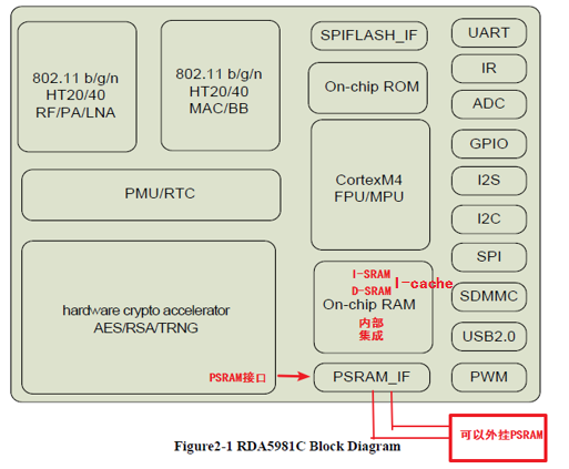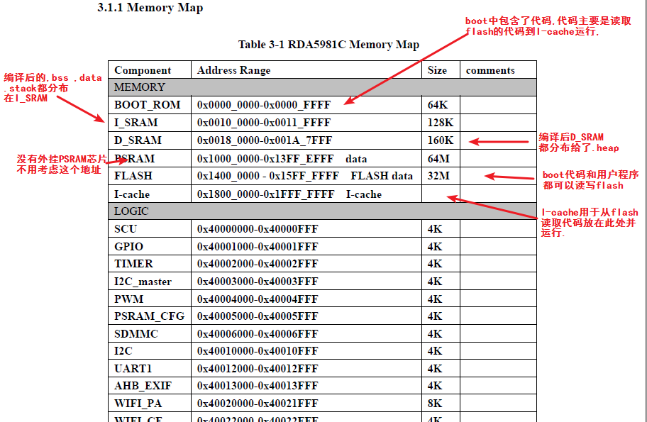 如下图,RDA5981芯片内部有三个RAM区域, I_SRAM,D_SRAM,I_cache, 还可以外挂PSRAM,