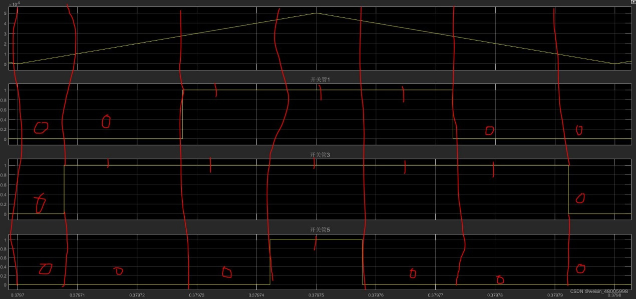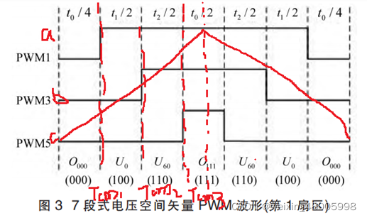 图(a)中N的值为1,表示参考电压矢量在第二扇区。结合二扇区的7段式的发波,验证模型的正确性。