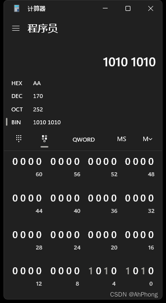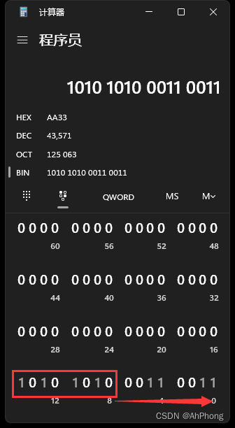 首先将1010 1010 0011 0011右移8位,高8位1010 1010移到低8位上,而原本低8位0011 0011右移后就溢出没有了,所以结果是1010 1010,然后1010 1010 & 1111 1111 = 1010 1010,十六进制是0xAA。0xAA = 1010 1010 = 0x00AA = 0000 0000 1010 1010,只是数据类型不一样,一个8位,一个16位都是等价的。