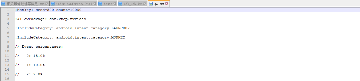adb shell monkey -p com.ktcp.tvvideo -v 10000 > C:\Users\Administrator\qa.txt
