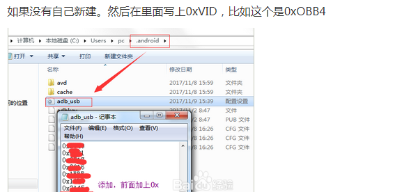 (若不显示设备信息:我的电脑右键-设备管理器-右侧Android phone-右键选择属性-详细信息-选择硬件id-记录VID值-进入到C:\Documents and Settings\(你的用户名)下。进去找到adb_usb.ini文件-把你的VID值写进去如下图:然后重新连接输入命令就可以了)