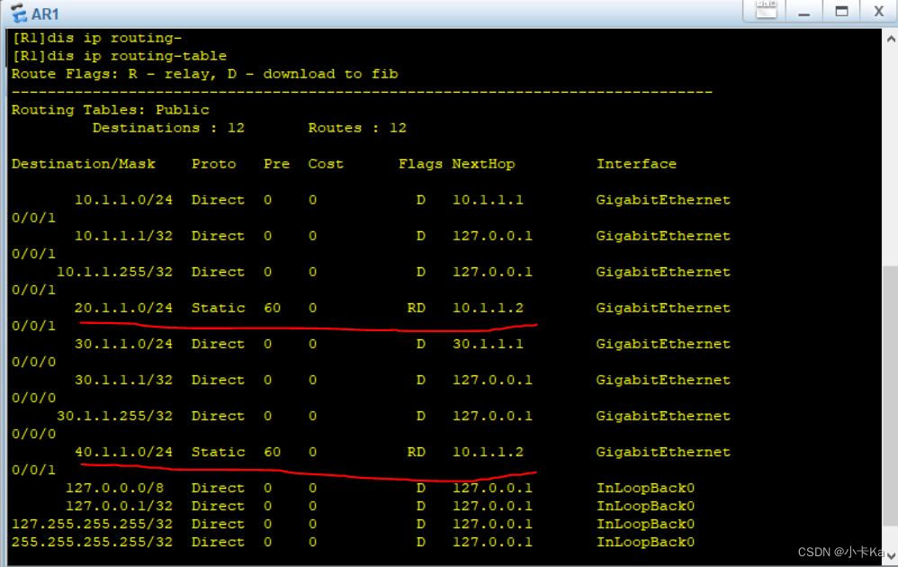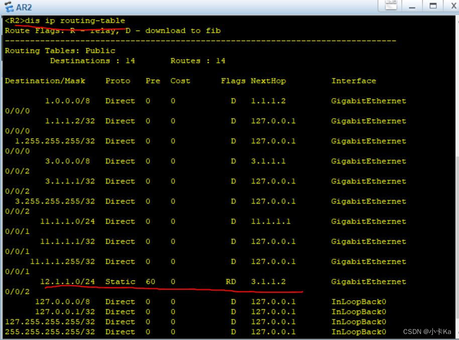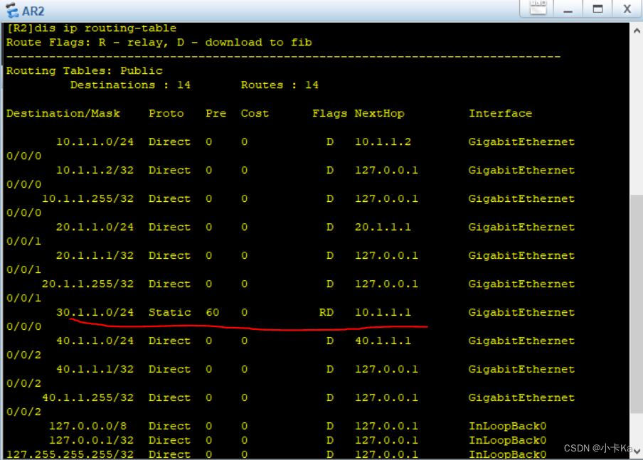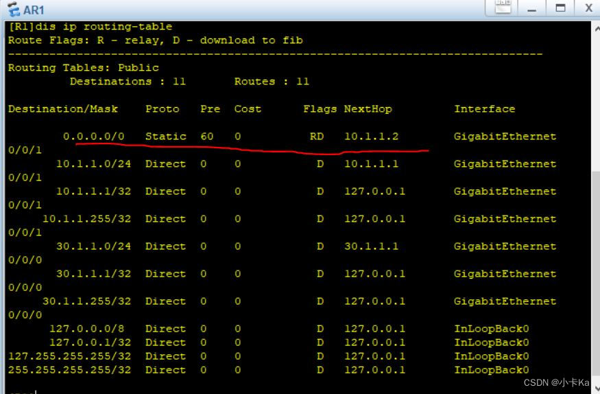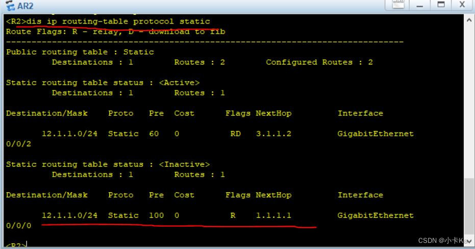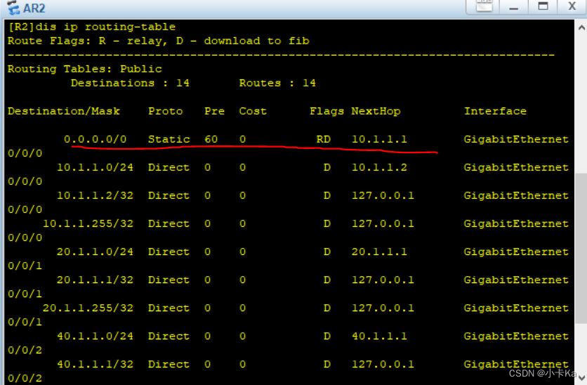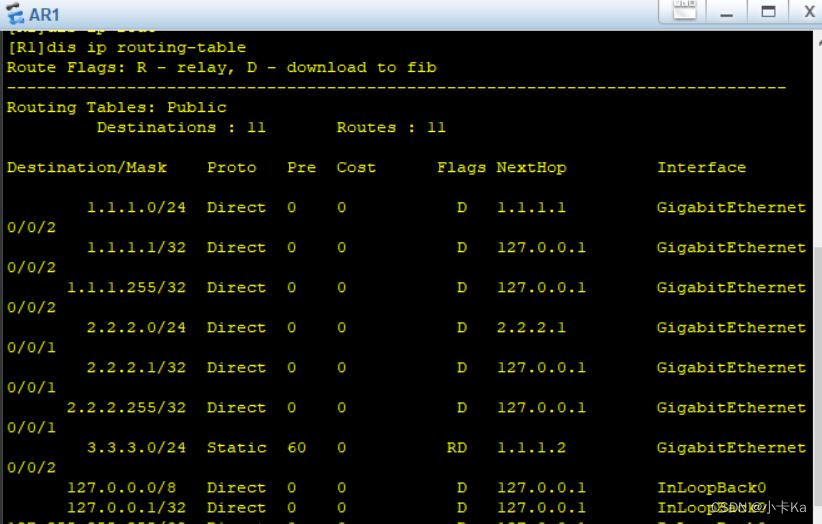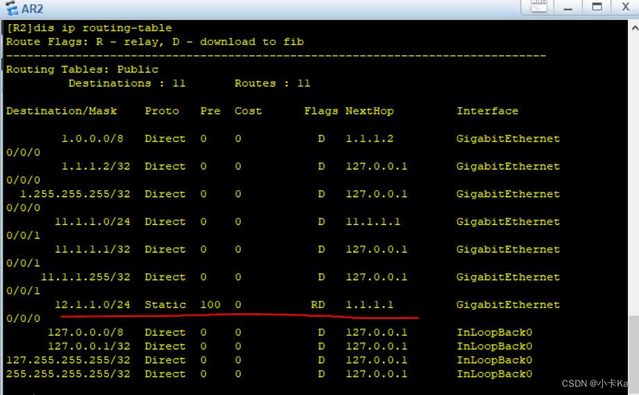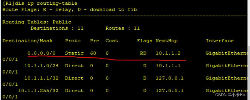 在路由表中,静态路由的Proto字段显示为Static,默认情况下,路由优先级Pre为60,路由开销Cost为0。